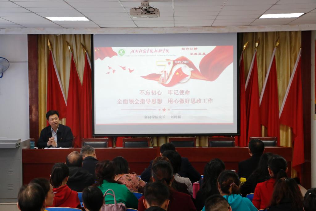 在我院深入开展“不忘初心、牢记使命”主题教育之际,按照学校“不忘初心、牢记使命”主题教育实施方案要求,10月31日下午,院长刘鸣韬在老校区12号教学楼601党员活动室作题为《全面领会指导思想 用心做好思政工作》的主题教育思政课。院党委书记张忠迪、副院长张宝剑、党委副书记王秀金,各系部负责人、思政课教师、辅导员和学生党员代表共同聆听了这堂思政课。