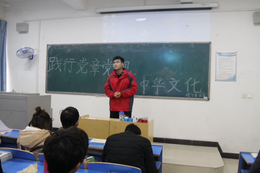 活动开始前由学生会主席单磊向大家说明了本次活动的目的及意义,酒店142班长袁轲介绍活动流程,并通过播放视频的形式让同学们更直观地了解中华民族的优秀文化。之后预备党员代表朱伟进行发言,和大家分享了作为预备党员的心得与体会。最后由单磊对本次活动做出总结并对预备党员提出要求。至此,本次活动圆满结束。