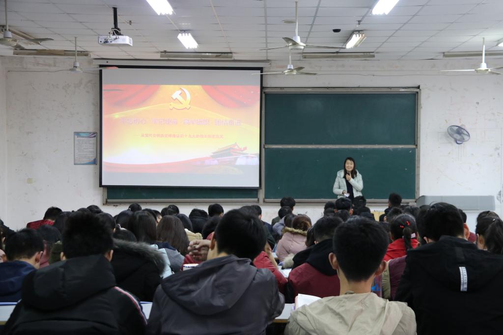 为深入贯彻落实中共十九大精神,加强大学生的理想信念与意识形态建设,12月7日下午,食工系在12号教学楼合八教室开展学习十九大讲党课活动。食工系第一党支部书记张晓娜及食工系2017级全体学生参加了本次活动。