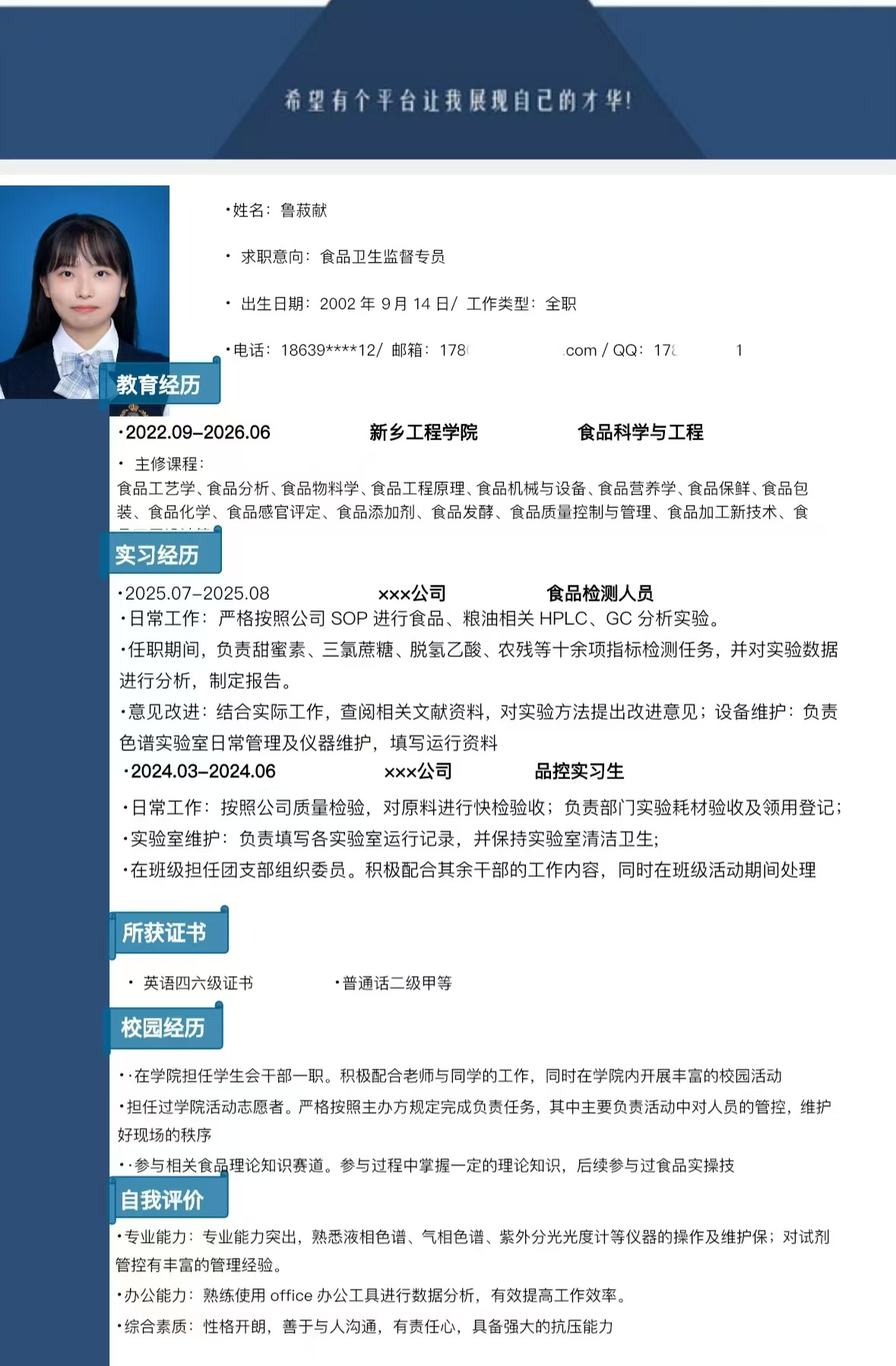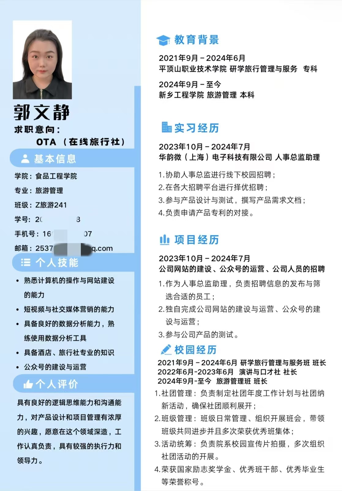 “点亮求职路,简历伴我行”主题简历设计大赛于10月28日至10月30日由食品工程学院团总支成功举办。此次大赛旨在提高食品工程学院全体在校学生对简历的重视程度,同时让同学们学会打造彰显自身独特风格的简历,面向全体在校学生,可自由报名,通过邮件提交作品。
