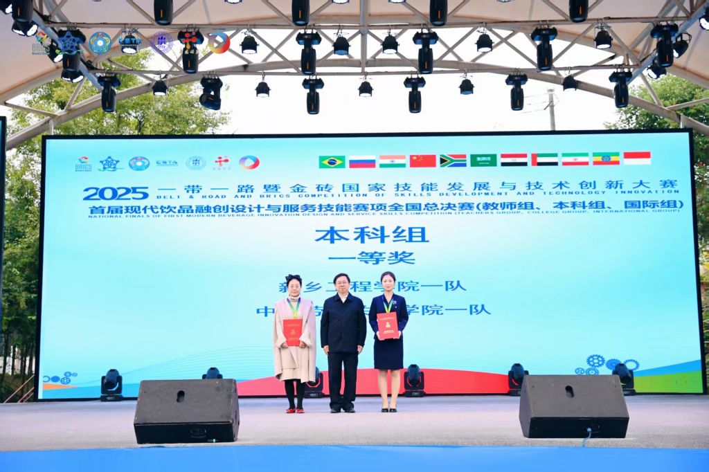 11月6日至11月9日,由金砖国家工商理事会中方理事会、一带一路暨金砖国家技能发展国际联盟、“一带一路”暨金砖国家技能发展与技术创新培训中心等单位主办,由四川省旅游学校等单位承办的2025一带一路暨金砖国家技能发展与技术创新大赛——首届现代饮品融创设计与服务技能赛项全国总决赛(教师组、本科组、国际组)在成都举行,经过前期初赛选拔,进入总决赛的55队中,我校食品工程学院学生李佳美、杨晓佳两位同学,凭借融合“一带一路”文化元素的饮品设计与专业服务表现,在本科组竞赛中脱颖而出,成功摘得本科组一等奖,我校荣获赛事“最佳组织奖”!
