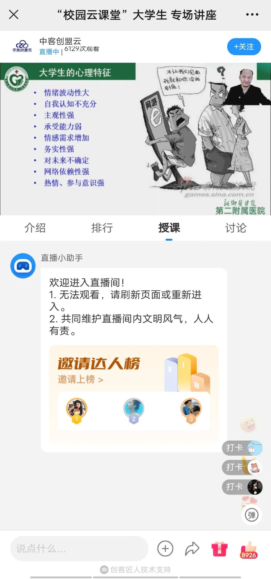 为切实加强学生心理健康教育工作,尤其是当前新冠肺炎疫情对学生造成的心理压力,有效控制学生中可能出现的心理危机。食品工程学院积极响应成人网址市卫生健康委和成人网址市教育局号召,于5月18日上午9点组织学生线上观看2022 年“千人百场”健康科普志愿服务活动——“校园云课堂”大学生专场讲座。