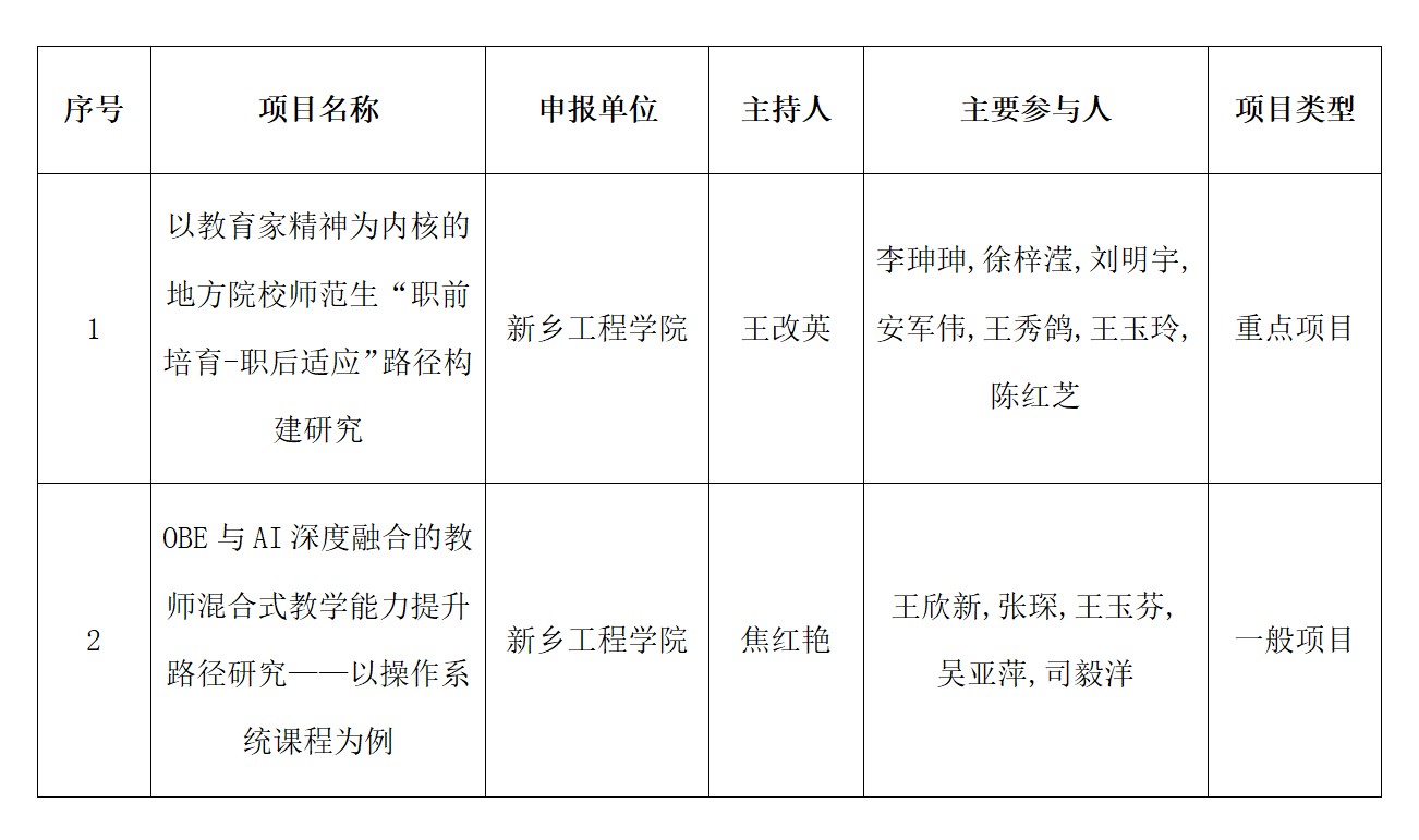 近日,河南省教育厅公布了2026年河南省教师教育课程改革研究项目立项名单。经专家评审,我校申报的2个项目成功立项。其中,《以教育家精神为内核的地方院校师范生“职前培育—职后适应”路径构建研究》获批重点项目,《OBE与AI深度融合的教师混合式教学能力提升路径研究——以操作系统课程为例》获批一般项目。
