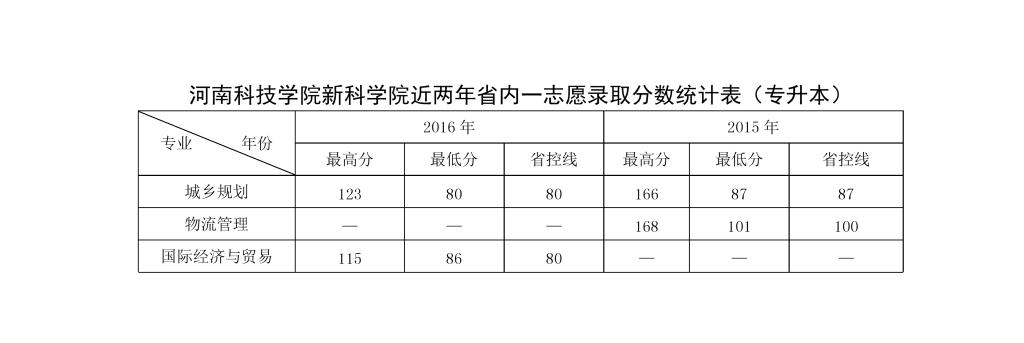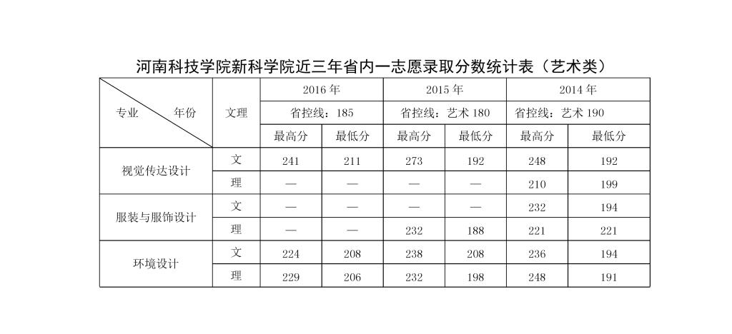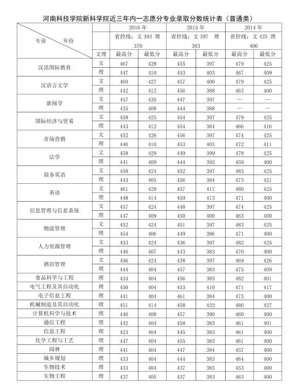 2014-2016年河南科技学院新科学院各专业录取分数统计表