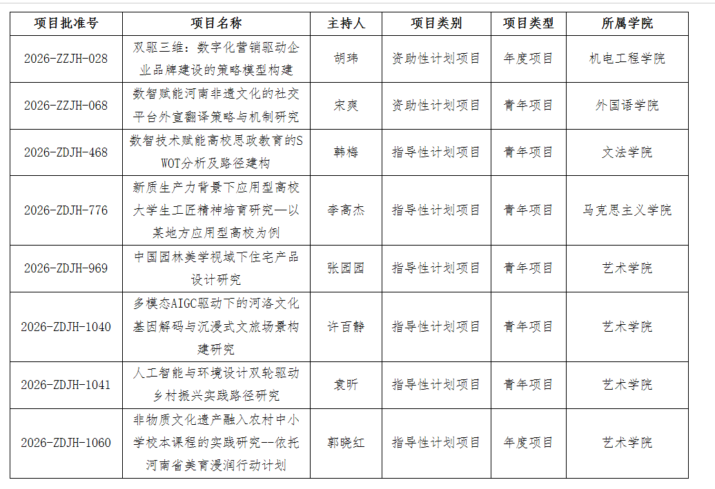 近日,河南省教育厅发布《关于下达2026年度河南省高校人文社会科学研究一般项目立项计划的通知》(教社语〔2025〕147号),我校8个项目获批2026年度河南省高校人文社会科学研究一般项目立项,其中资助性计划项目2项,指导性计划项目6项,现将立项名单予以公布,并就有关事项通知如下: