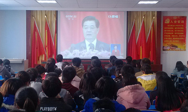 按照新科学院《关于组织收听收看十八大开幕式的通知》要求,11月8日上午九点整,化工系副主任程海军,团总支书记李玉青,辅导员赵文姬及部分教师、学生党员、学生干部代表分别在该系办公室、党员活动室、学生宿舍收看了十八大开幕式盛况。中午,该系又组织其他学生干部和学生代表100余人,在党员活动室重温了十八大开幕式的盛况。