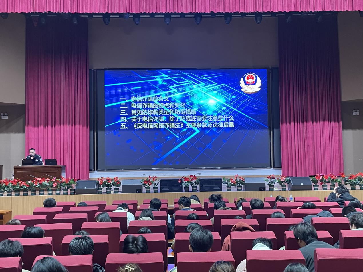讲座中,宣讲警官王雪以“远离毒品 珍惜生命”为题,通过大量的典型案例,围绕当前毒品的概念和分类、吸毒的危害以及大学生如何预防毒品侵害等进行了详细的讲解,加深师生对毒品的认知,筑牢校园禁毒防线。宣讲警官杨勇波以《共同防范电信网络诈骗》为题,结合近年来发生的典型诈骗案例,从五个方面分析了如何增强防范电信网络诈骗意识与工作能力:一是电信诈骗的含义;二是电信诈骗的特点与变化;三是常见的诈骗类型和防范措施;四是关于电信诈骗的防范事项;五是《反电信网络诈骗法》主要条款及法律后果。