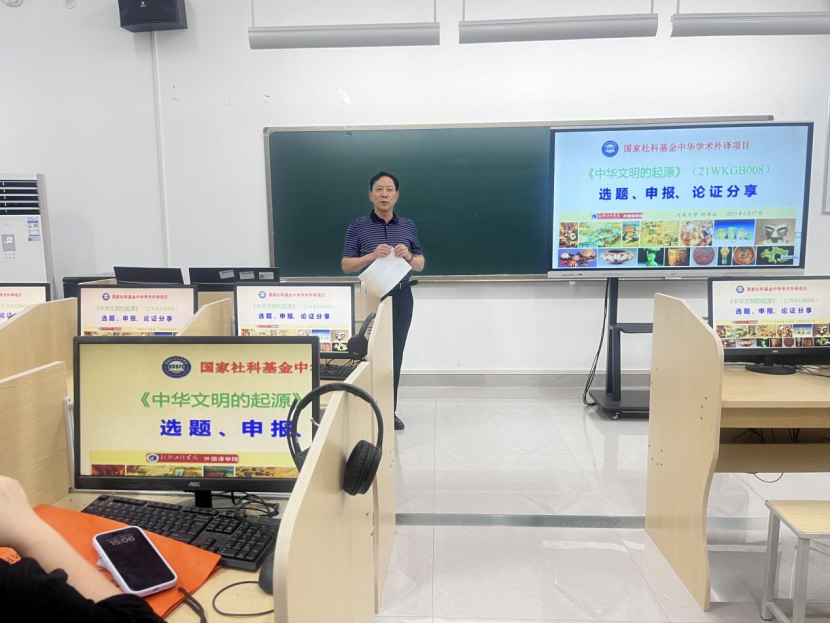 为提升教师科研能力,助力国家社科基金中华学术外译项目申报,6月27日,外国语学院在语音室3成功举办国家社科基金中华学术外译项目选题申报论证分享会,特邀河南大学二级教授、博士生导师、河南省特聘教授刘泽权教授担任主讲嘉宾,会议由院长梁晓冬主持,全体教师参加。