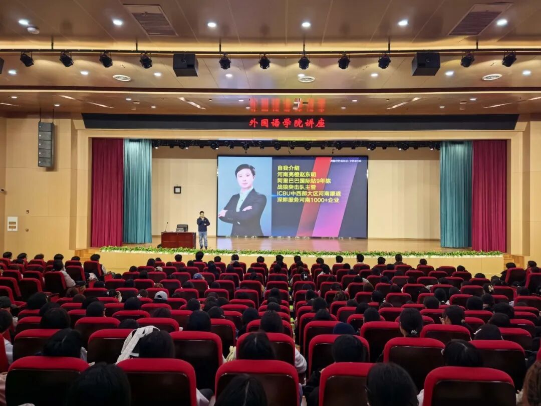 为帮助学生明晰职业发展方向,深入了解外语专业在跨境贸易领域的应用前景,10月24日上午,外国语学院在北校区文渊楼报告厅成功举办了职业规划指导讲座。讲座特邀河南省亮橙网络技术有限公司监事、阿里巴巴中西部大区负责人赵东明先生担任主讲。外国语学院2025级新生及辅导员聆听讲座。