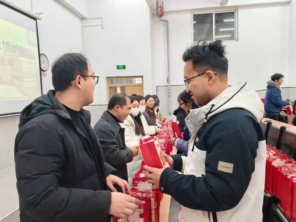 张震结合自身经历与教育心得,对同学们的坚持与付出给予了高度肯定。他指出,考研不仅是一场知识的较量,更是一次意志的锤炼,学院始终是同学们最坚实的后盾。他勉励大家要保持平和心态,科学备考,将学院的殷切期望转化为前进的动力,并祝愿每一位同学都能在考场上发挥出色,实现自己的理想。在温馨的礼包发放环节,各位辅导员老师亲手将满载着关怀与祝福的“考研暖心加油包”递到同学们手中。每份礼包都经过精心准备,体现了学院对学子们细致入微的关爱。老师们与同学们亲切交流,耐心解答备考疑问,现场洋溢着浓浓的师生情谊,全体师生在活动最后合影留念。