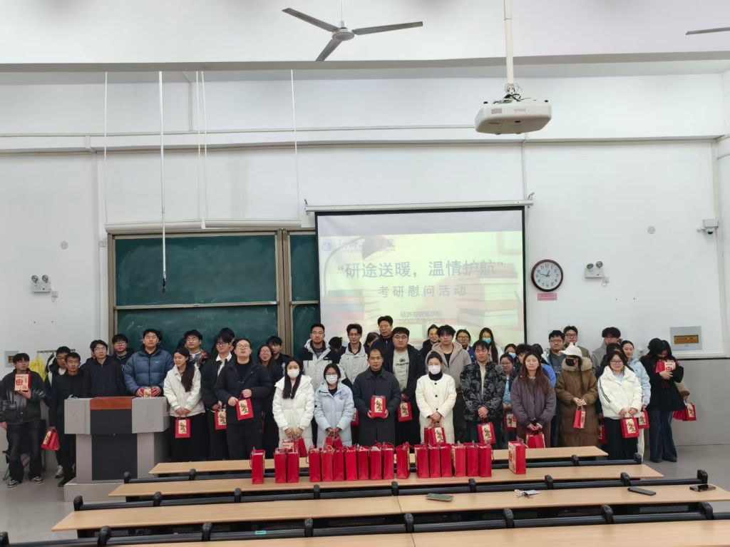 为鼓舞考研学子士气,传递学院温暖关怀,12月8日,经济与管理学院于教1-107教室举行“研途送暖,温情护航”考研慰问活动。院党委常务副书记张震、团委书记王康、毕业生辅导员及全体在校准备考研的学子们共同参加了这场充满温情与力量的慰问活动。