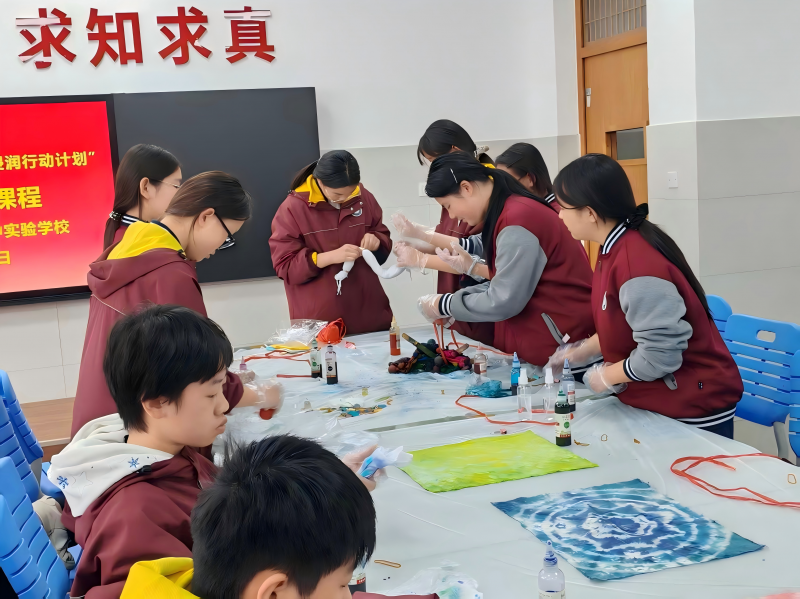 课程实施过程中,团队注重理论与实践相结合,系统讲授扎染技艺的历史渊源与审美价值,并指导学生完成从设计、捆扎到染色、固色的完整创作流程。与此同时,除了本次美育实践教学之外,还协助黎阳中学正式建立了“扎染艺术”兴趣小组,配备了基础工具材料,制定了活动方案与教学计划,为学生掌握美术特长、提升审美能力奠定了基础。