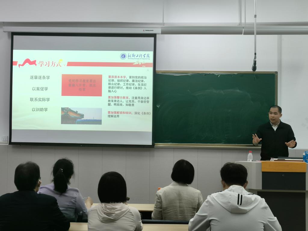 为深入学习习近平总书记关于党纪学习教育的重要讲话和重要指示精神、认真学习研读新修订的《中国共产党纪律处分条例》,按照学校《关于在全校党员中开展党纪学习教育的工作方案》的通知要求,生物工程学院于5月7日下午召开党纪学习教育理论学习中心组专题学习会议,学院副书记晋跃栋主持会议,全体中心组成员参加学习。