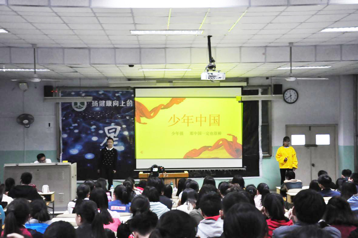 本次星空讲堂分为三个环节“观之,闻之,切之”。在现场,主持人以近期热播电影《战狼2》为话题,引出了本次讲堂的主题——爱国。在第一个环节“观之”,同学们观看了《我是演说家》中关于爱国的三段精彩演讲视频。看完视频同学们陷入沉思,随后踊跃发言,表达了自己的感受。在第二个环节“闻之”,魏燕丽老师深情的演讲点燃了在场师生的爱国热情,使每位师生感受到了祖国的强大,感受到了作为一名中国人强烈的自豪感。随后,李浙浙、赵亚宁、申祥同学朗诵了《少年中国说》,让在场同学备受感染,齐声呐喊:“美哉我少年中国,与天不老;壮哉我中国少年,与国无疆”!切时事世事,论少年中国,在“切之”环节,学生代表刘梦迪发表了她的演讲,谈论了时事世事、中国少年。最后,在张之璐和宗亭亭《少年中国》的歌声中,本次星空讲堂圆满结束。