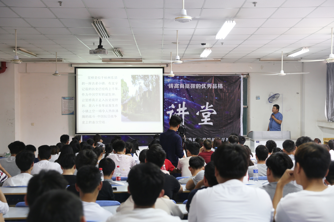 在讲堂开始之前,信工系辅导员张明飞老师演奏了一曲铿锵有力的《空军进行曲》,赢得了在场师生的阵阵掌声。本次“星空讲堂”活动主要分为“我听”、“我看”、“我记”、“我诵”四个环节。在“我听”环节,秦小平主任首先介绍了我国的空军发展史,让同学们领略了我国空军的强大力量。接着介绍了中国近代空军的摇篮——笕桥航校及其建校史、建校背景和培养出来的一批批英雄战士。在“我看”环节,秦小平主任通过放映幻灯片和纪录片的形式向同学们展示空军战士的勇猛无畏。他指出,战士们勇于为国家献身的精神和敢于牺牲的决心,永远值得每一个人学习。在“我记”环节,他强调,当今的人们看似生活在和平年代,但事实上并没有一刻是真正的和平,同学们要居安思危,时刻保持危机意识。中华民族正走在建立富强、民主、文明、和谐的社会主义建设的道路上,同学们要时刻牢记自己肩上的责任。最后,在“我诵”环节,在学生代表的带领下,全体同学齐声诵读了《少年中国说》。
