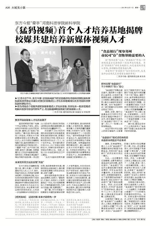 12月11日,《东方今报》第6版对我院与东方今报·猛犸视频联合,建立河南省首个校媒联手共建的新媒体视频人才培养基地的新闻进行了报道。随后,猛犸新闻、UC新闻、网易新闻、手机百度、搜狐新闻、今日头条等新闻媒体纷纷对该新闻进行了报道与转发。
