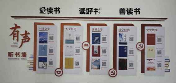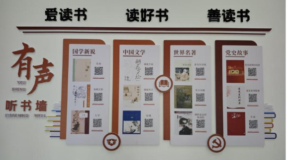 “有声听书墙”设置于馆内二楼东南和西南墙面,图书内容分为抗日战争、长征系列、军事文学、颂党情、纪实文学、中外名著、国学新说等15个模块,每个模块中有多个读物,后续还会不定期更新资源,读者只需用手机扫一扫各模块中的二维码,不用下载安装,在校园内可随时随地收听精选有声读物。