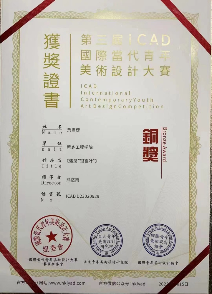 获河南省社科成果奖3等奖1项、河南省大艺展1等奖1项、河南省高校教师作品展铜奖一项,河南省教育科学1等奖1项;主持科技厅项目2项已结项、教育厅项目3项已结项。