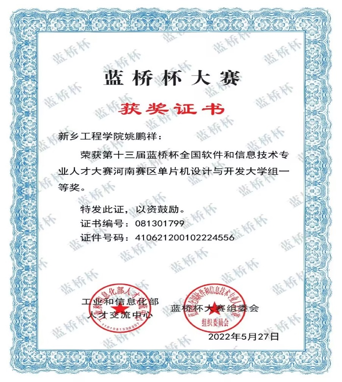 男,汉族,计算机科学技术专业2015届毕业生。在校期间曾担任河南科技学院信工学院单片机创新小组负责人,多次在大学生电子设计竞赛等专业竞赛中获奖,荣获“河南省优秀毕业生”、“三好学生”等荣誉称号。