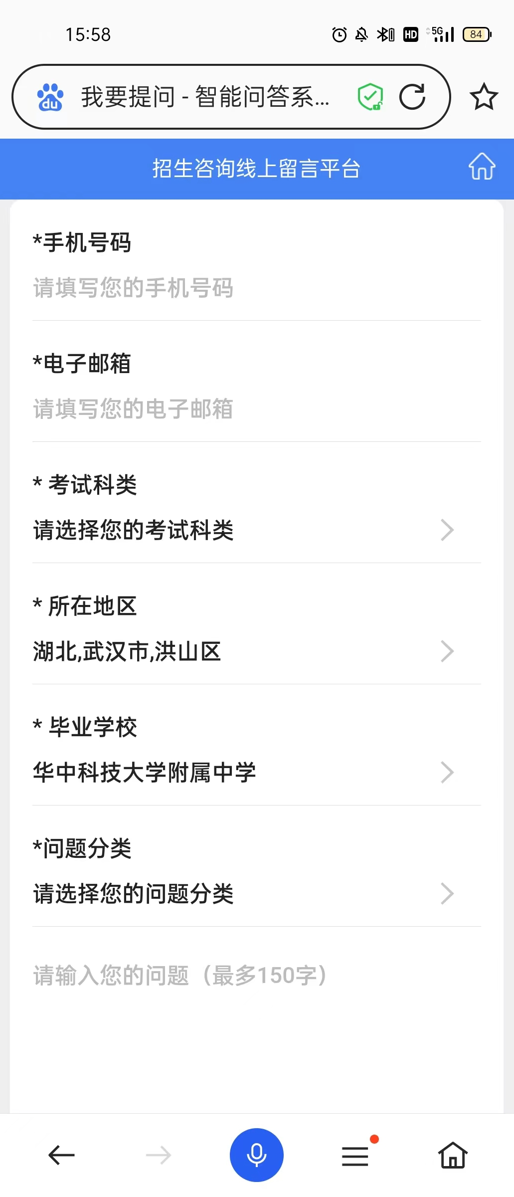 准确填写基础信息后可进行提问;输入问题,系统可自动识别常见问题关键词并给予智能回复。