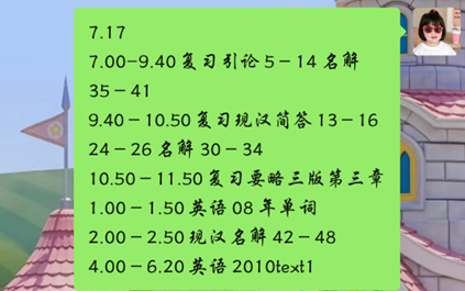 一般我都是上午七点左右起床,七点半开始背英语单词,九点到十一点半一般都是背诵专业课的时间;下午休息过后,两点开始进入学习状态,下午的时间可以用来刷题、看相关的网课等;晚上学完专业课之后,八点半到十点半我会选择复习一天的内容,快速过一遍早上背过的英语单词、专业课的相关内容等,防止遗忘。