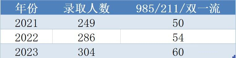 详细数据:2021年,学校共有249名学生成功录取为硕士研究生,其中50名学生被“985”“211”“双一流”建设高校录取;2022年,学校共有286名学生成功录取为硕士研究生,其中54名学生被“985”“211”“双一流”建设高校录取;2023年,学校共有304名学生成功录取为硕士研究生,其中60名学生被“985”“211”“双一流”建设高校录取。