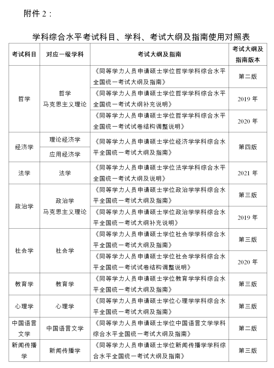 申请学科在附件2所列学科范围内的同等学力人员,须参加全国统一组织的学科综合水平考试,考试科目、所用考试大纲及指南见附件2。