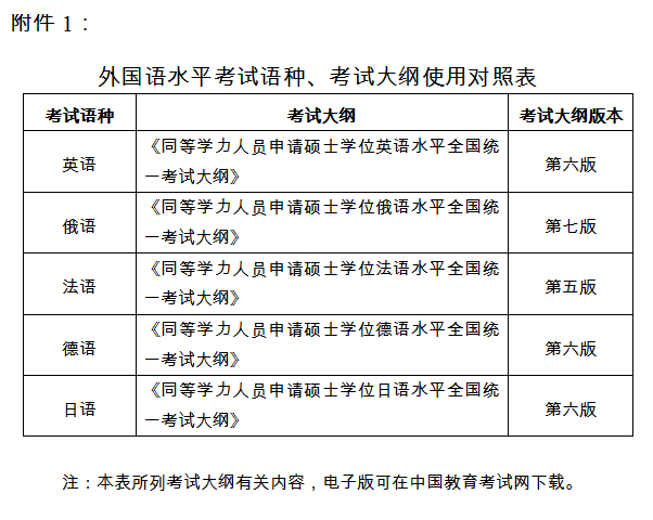 附件:1.外国语水平考试语种、考试大纲使用对照表