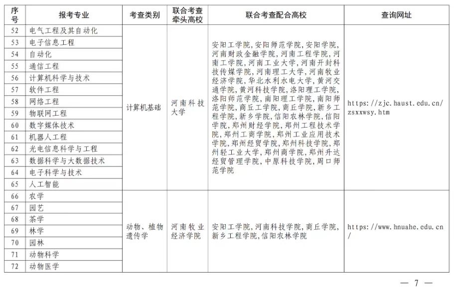 二、合理制定联考方案。各联合考查组要根据本专业大类培养目标和对考生能力的要求,结合报考情况,合理制定联合考查方案,明确高校考查时间、考查地点、考查方式、录取规则、联系电话、网址等事项。各牵头高校要于3月6日前将联合考查方案上传至“河南省普通高校招生章程核定系统”(网址:http://zszcba.haedu.gov.cn)进行核定,3月20日前向社会公布。考生可登录附表中的相关网址进行查询。